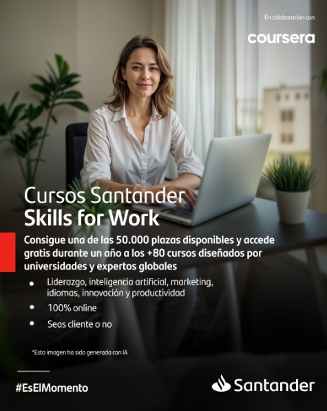 Banco Santander lanza una convocatoria de 50.000 plazas gratuitas del Curso Santander | Skills for Work con el fin de mejorar la empleabilidad a través de formación continua en habilidades clave como inteligencia artificial, liderazgo o idiomas.