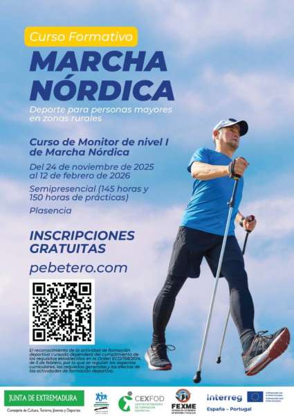 - Curso de Monitor/a de Nivel I en Marcha Nórdica en Plasencia, del 24 de noviembre de 2025 al 12 de febrero de 2026. Modalidad semipresencial (145 horas + 150 horas de prácticas). Este curso permitirá adquirir las competencias necesarias para enseñar y dinamizar la práctica de la marcha nórdica en entornos rurales.