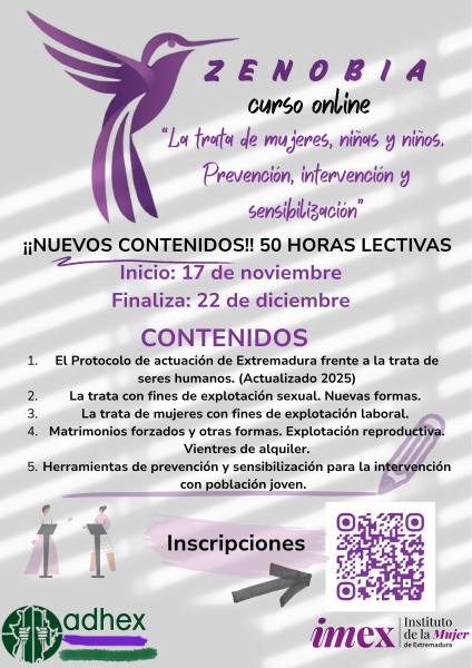 La Asociación Derechos Humanos y de las mujeres de Extremadura -Adhex- ofrece el curso "Zenobia. La trata de mujeres, niñas y niños. Prevención, intervención y sensibilización", en el que se abordará el Protocolo Extremeño contra la Trata de Seres Humanos con Fines de Explotación Sexual que ha sido actualizado y presentado este año, herramientas de prevención y sensibilización para la intervención con población joven, entre otros contenidos.