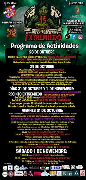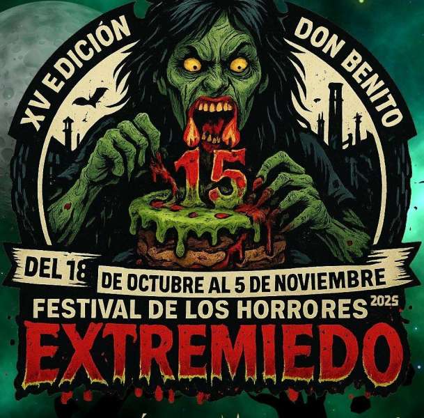 La Asociación Achikitú organiza la XV edición del Festival de los Horrores EXTREMIEDO en Don Benito. El festival cuenta con la implicación de más de 70 voluntarios y voluntarias que harán posible una programación repleta de actividades, talleres, espectáculos, conferencias, concursos y los esperados pasajes del terror.