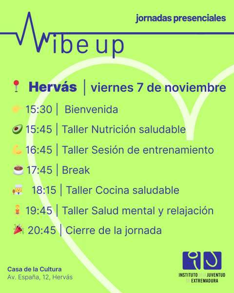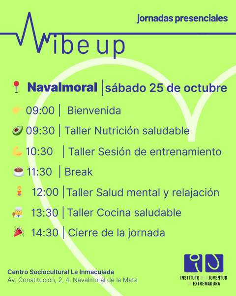 El Instituto de la Juventud de Extremadura pone en marcha las Experiencias Vibe Up!, una jornada que revoluciona la forma de cuidarse. Los participantes podrán descubrir cómo cambiar hábitos, comer mejor sin dramas, entrenar en equipo y mimar su salud mental con dinámicas prácticas y divertidas.