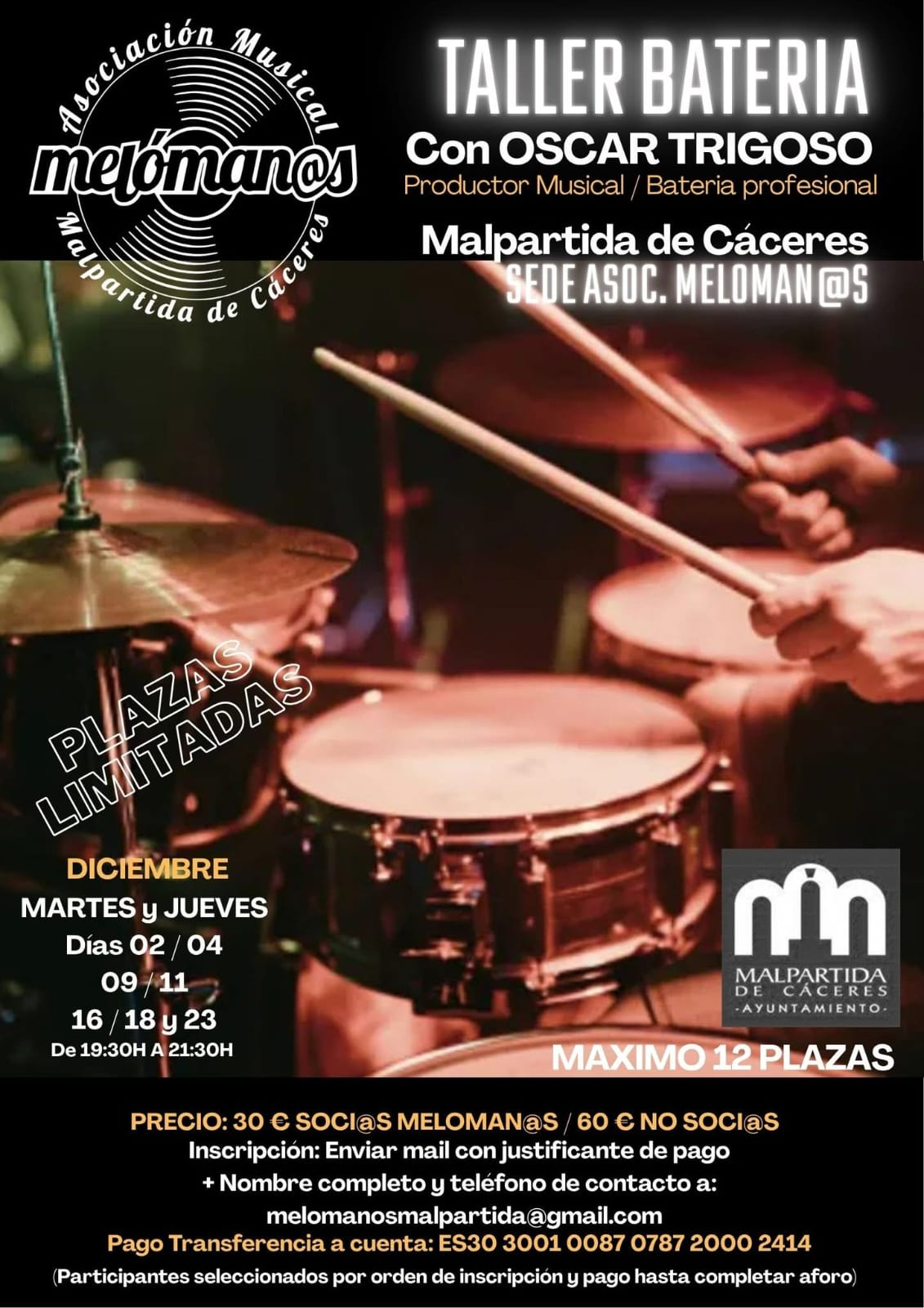 La Asociación de Melóman@s de Malpartida de Cáceres organiza Taller de Batería del 2 al 23 de diciembre.