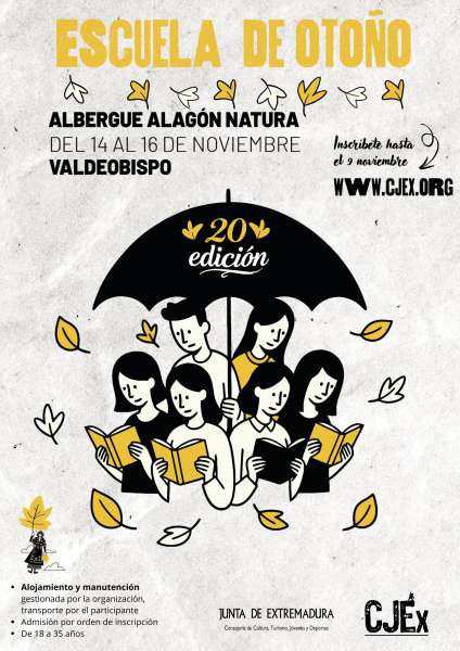 La Escuela de Otoño del Consejo de la Juventud de Extremadura se celebrará los días 14, 15 y 16 de noviembre en el Albergue Alagón Nature de Valdeobispo. Las plazas son limitadas y se asignarán por orden de inscripción.