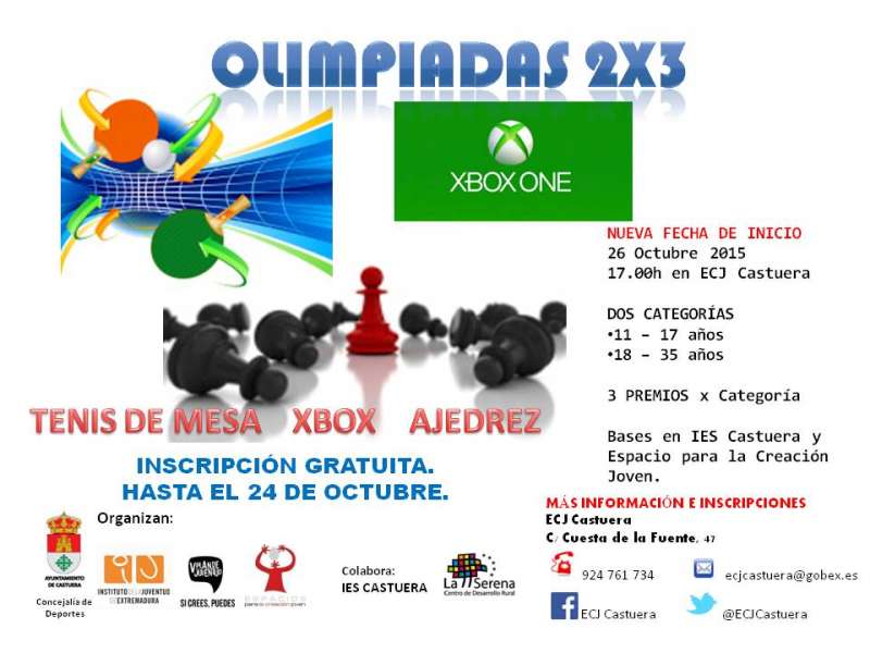 Olimpiadas 2x3 en el ECJ de Castuera, con pruebas de tenis de mesa, Xbox y ajedrez. Se establecen dos categorías: 6º de Primaria a 4º de ESO y de 16 a 35 años. La inscripción puede realizarse hasta el 24 de octubre